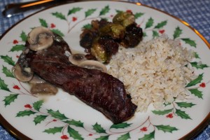 The grocery store recently had grass-fed steak tips on sale, and they looked quite fresh so I picked some up for dinner. When I got home I searched the Internet for some inspiration and found a recipe for steak with mushroom sauce. I had some frozen beef broth that I had made (yeast and sugar free) and made a few other changes to remove the onion. SensitiveHusband and I were really happy with the result. It was great enjoying a homemade sauce with our steak! Our sides included brown rice and roasted Brussels sprouts with grapes. We had a great meal.