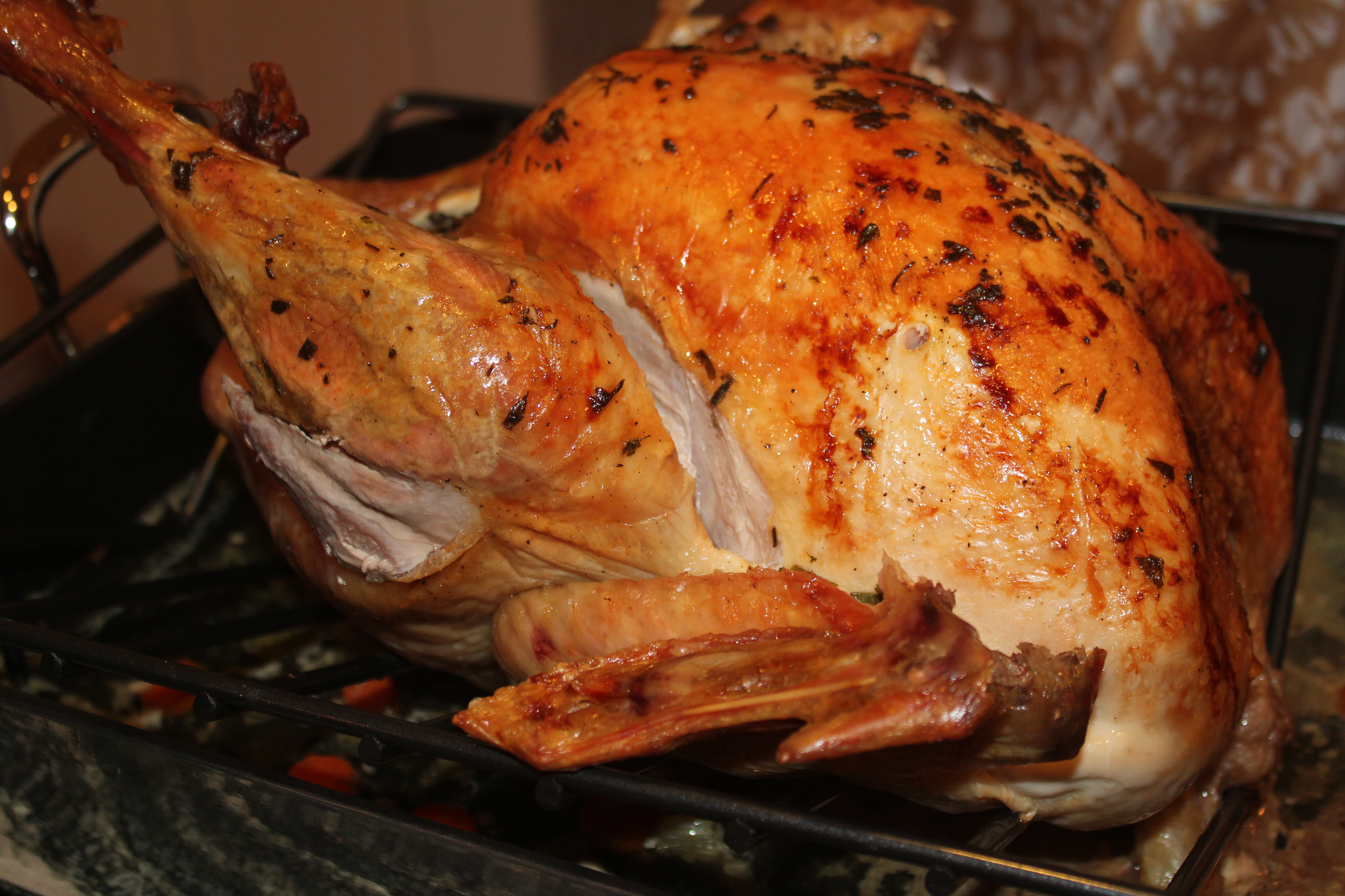 After the turkey came out of the oven, we let it rest for approximately 1/2 hour before carving so that the juices could redistribute.